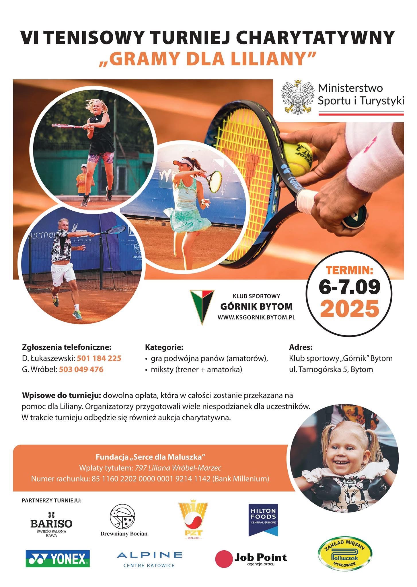 W dniach 6-7 września 2025 r. na kortach KS Górnik Bytom odbyła się VI edycja Turnieju charytatywnego „Gramy dla Liliany”. To wyjątkowe wydarzenie, któremu przyświeca szczytny cel – pomoc Lilianie. Obok rozgrywek mikstowych i deblowych uczestnicy imprezy biorą udział w licytacji, z której wszystkie środki przekazywane są na leczenie i rehabilitację Lilki.