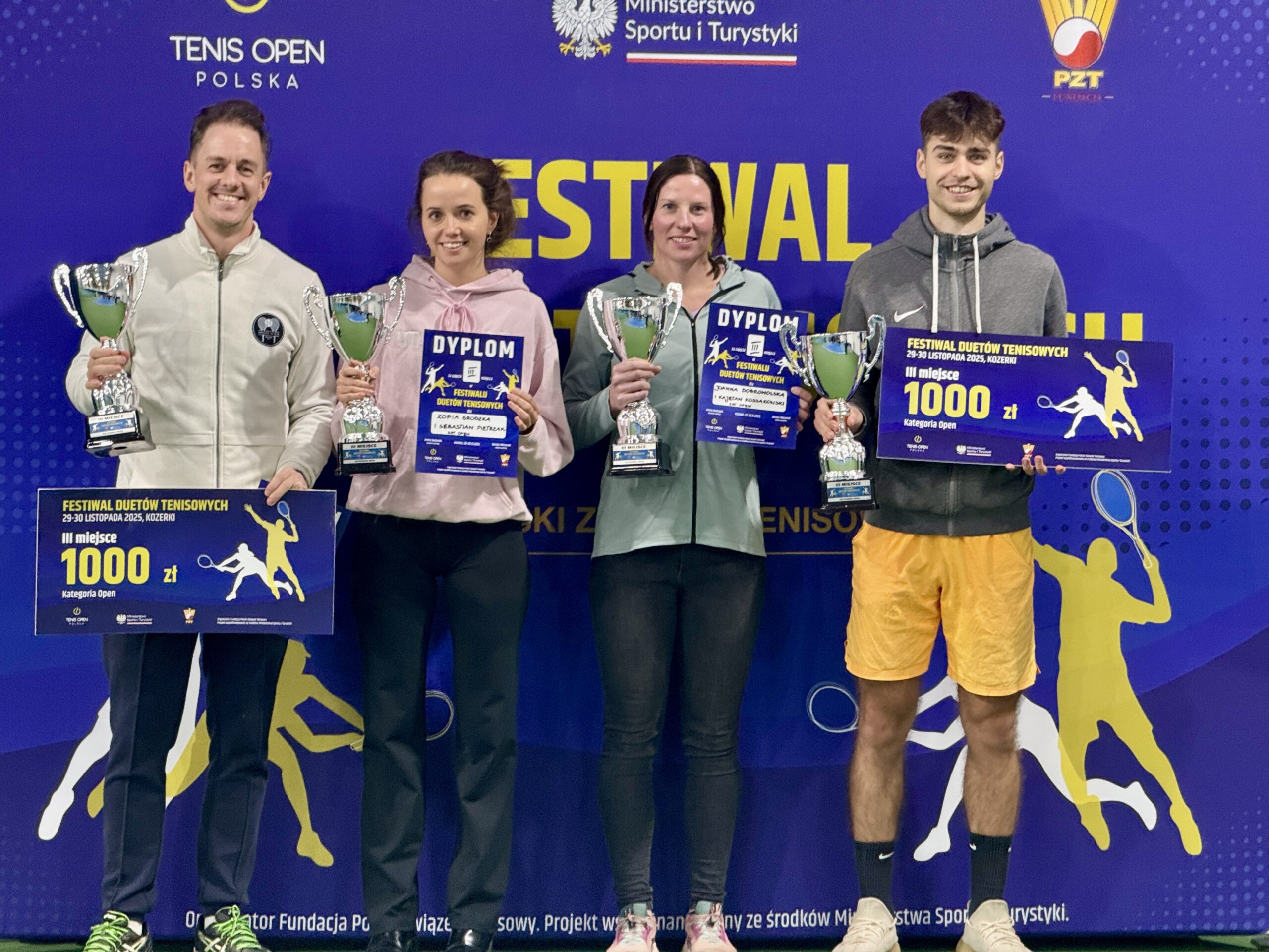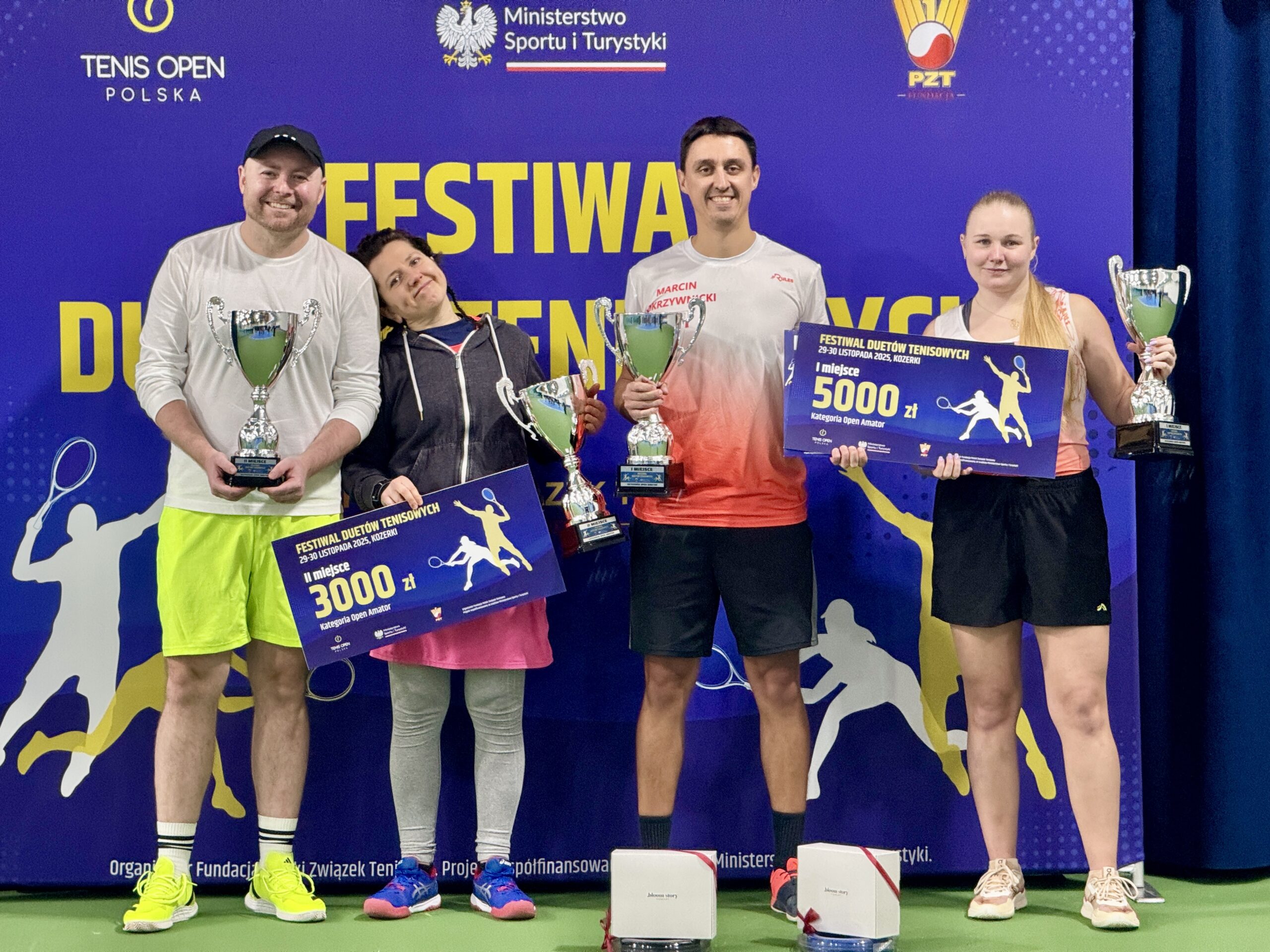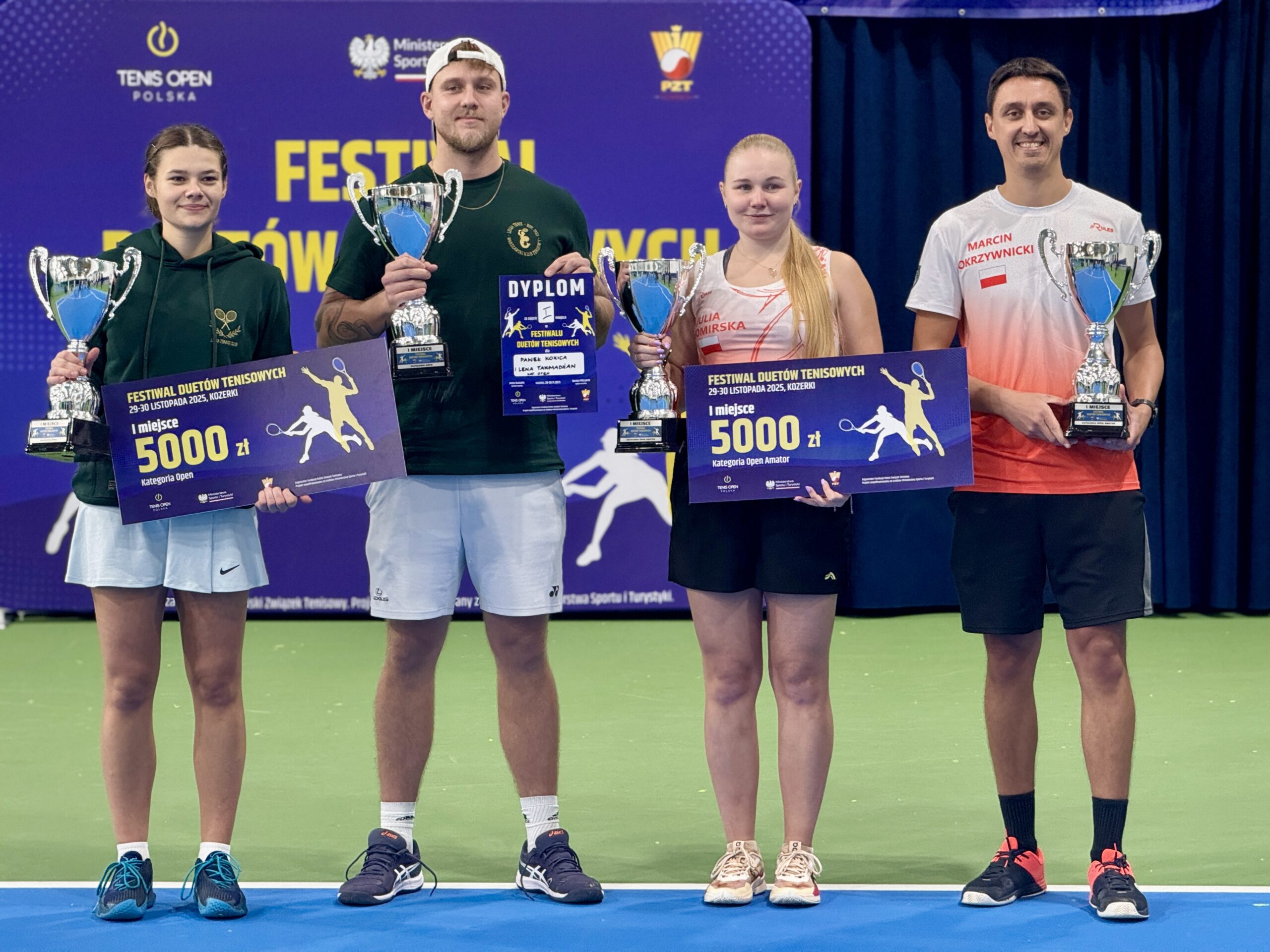 W dniach 29-30 listopada 2025 r. na kortach Tenis Kozerki odbył się Wielki Finał Festiwalu Duetów Tenisowych, który zgromadził nie tylko najlepsze drużyny, ale również szerokie grono kibiców oraz przedstawicieli środowiska tenisowego. W finałowych starciach nie brakowało długich wymian, zaciętej walki o każdy punkt oraz efektownych zagrań. Kibice mogli podziwiać zarówno zgrane duety z kategorii open, jak i ambitnych i świetnie grających reprezentantów kategorii open amator. W kategorii open bezkonkurencyjni okazali się reprezentanci województwa mazowieckiego Lena Takmadżan i Paweł Kozica, którzy od pierwszego meczu prezentowali tenis na najwyższym poziomie. W finale spotkali się z parą Katarzyna Nowak i Leszek Wrzesień, którzy również startowali w eliminacjach w Ożarowie Mazowieckim.